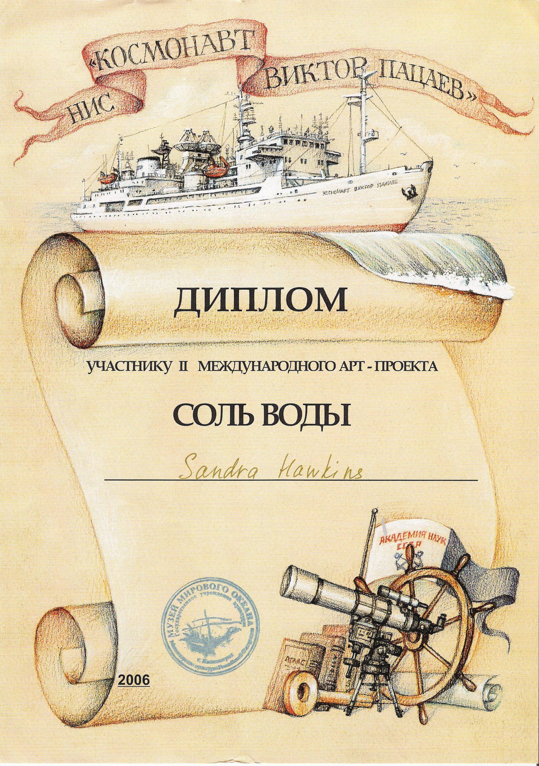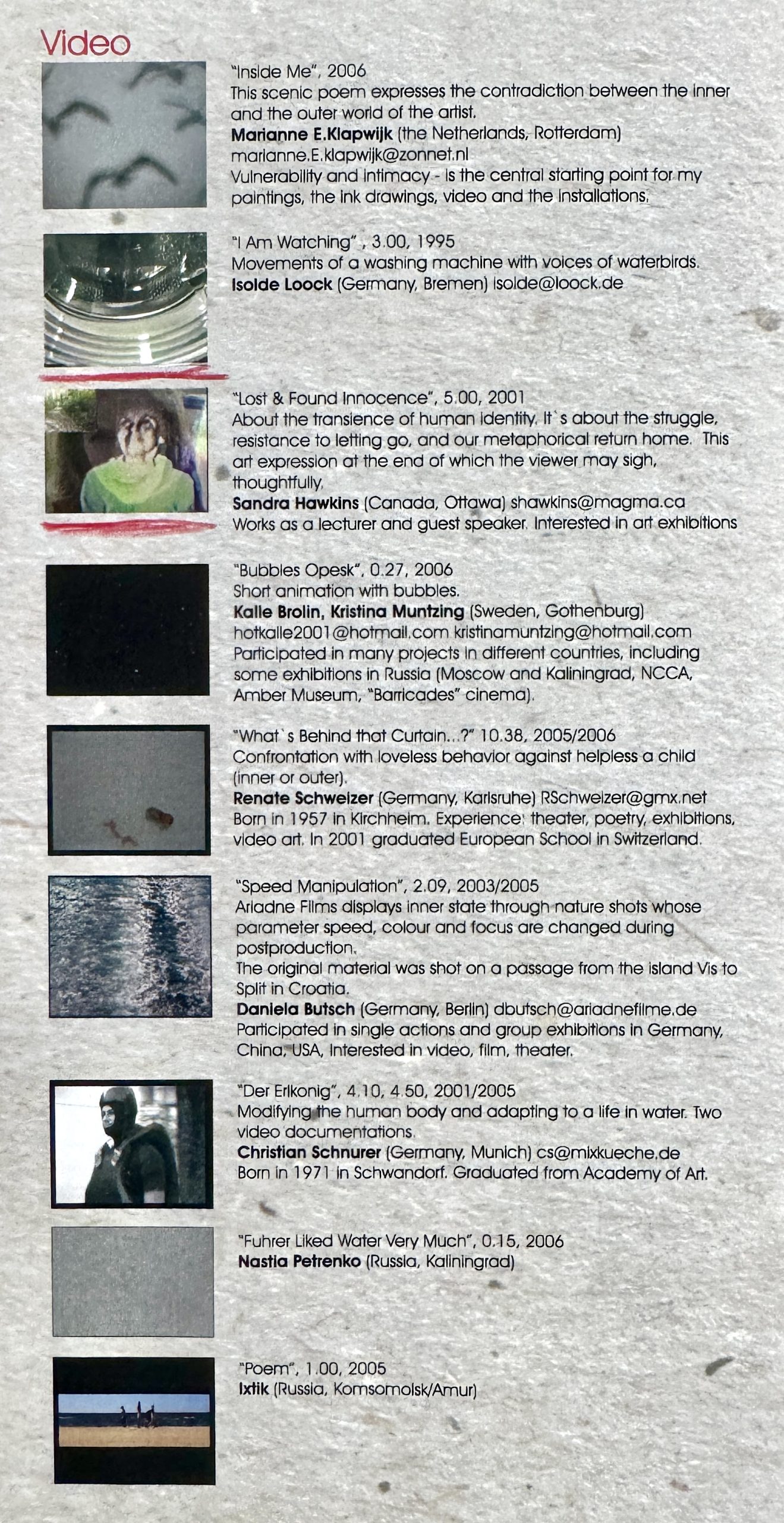 This artist’s short video, Lost and Found Innocence, was one of two works from Canada selected for screening at the “Salt of Water” International Multi-Media Festival in Kaliningrad, Russia, March 26 to 27, 2006. It was organized by the Museum of the World Ocean (photos), and also included juried media works from Germany, USA, Macedonia, Austria, Greece, Poland, France, Italy, Australia, Great Britain, Slovakia, Russia, Turkey, Sweden and Norway. Kaliningrad Region is situated between Poland and Lithuania on the Baltic Sea, a point at which salt water and river water mix and is Russia’s only all-year open-port.