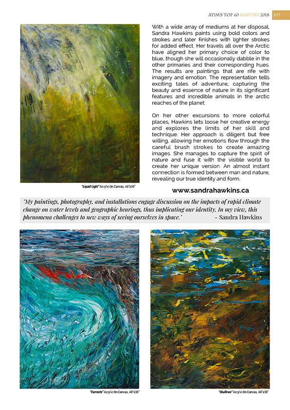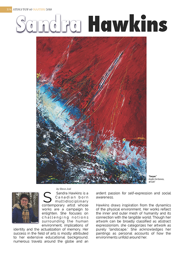 The ArtTour International Art for Peace exhibition at the Rio Gallery and the Top 60 Contemporary Artists Award presentation held at the Museum of Arts and Design in New York City provided international exposure for my paintings. The painting exhibited, Tempest, was also included in the ArtTour International publication, showing more of my work, Liquid Light, Currents and Shallows (each being acrylic on canvas, 48″h x 36″w). This publication has a distribution of 2.2 million through Barnes & Noble in 198 countries.