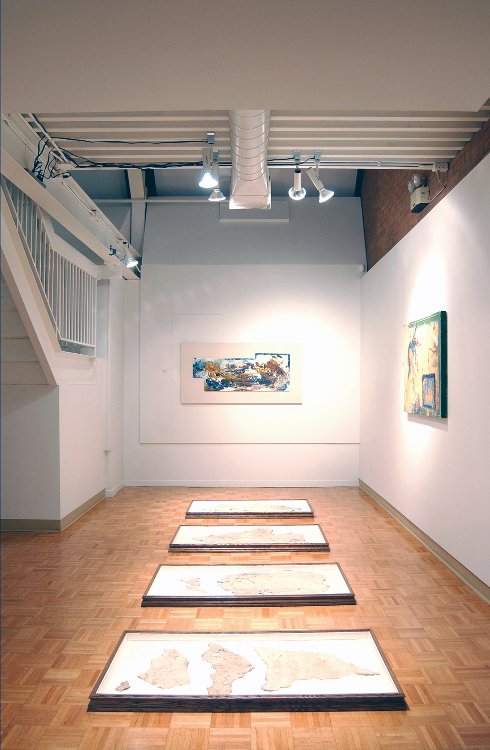 The secure positioning of the boxes on the floor allows room for visitors to walk between and around them while looking downward and into what become intimate spaces within a public gallery.