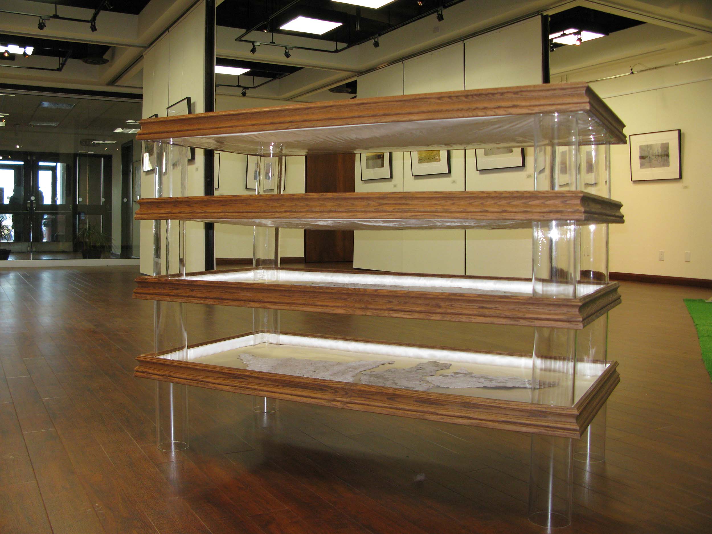 A layered assemblage of upholstered boxes, each holding shapes of naturally compressed river mosses and debris, found on the rocky shoreline of a shallow stretch of the Mississippi River at Carleton Place. Clear plastic cylinders separate the boxes. There is metaphorical meaning in each of the installation elements, in their assemblage, and in the visitor’s bending to look between and into the boxes, thereby completing this work. The narratives relate to human mortality, resistance to letting go, and, through kinesthetic perception, awareness of our interconnection with the whole.