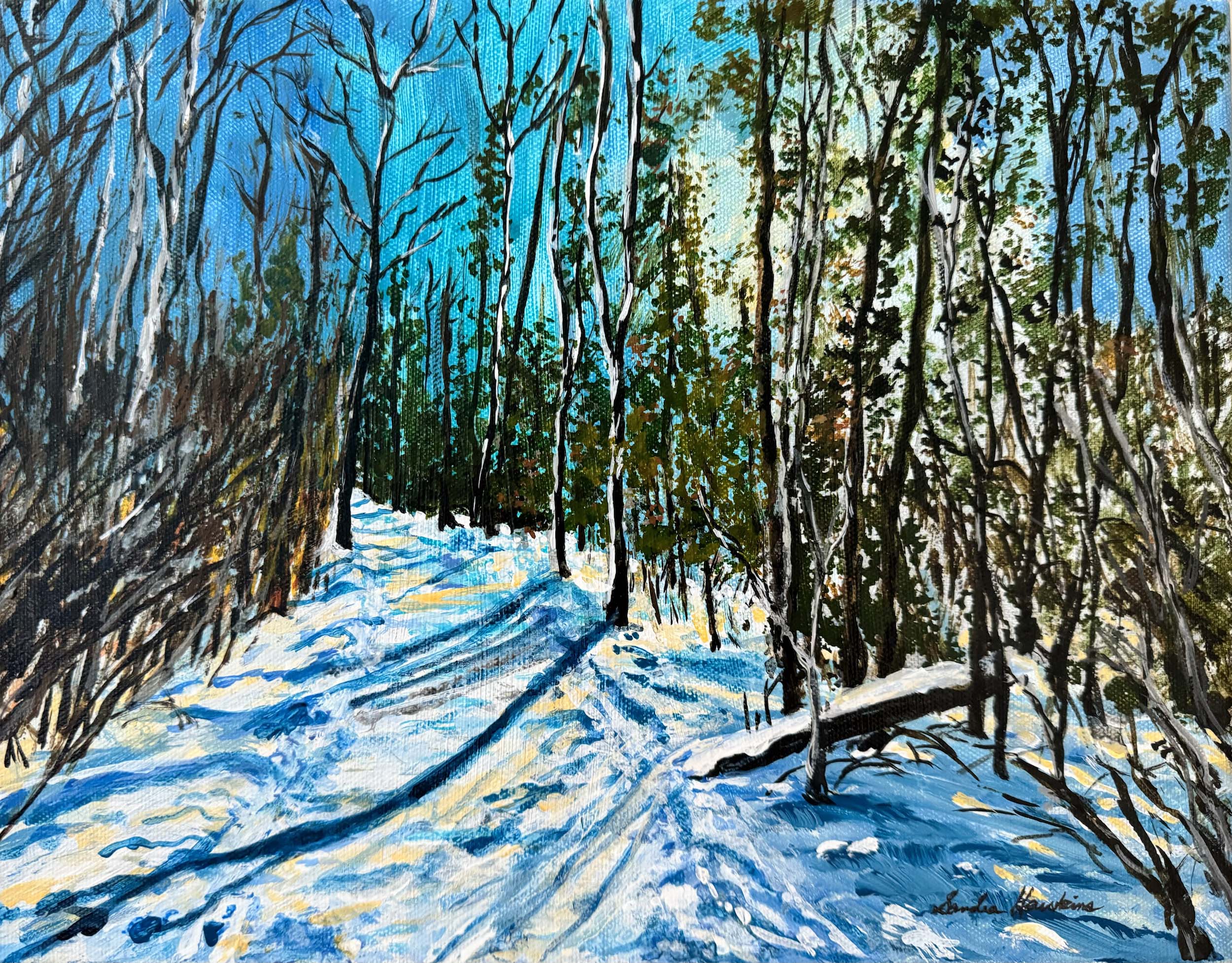 Pinhey Forest Trail, acrylic on stretched canvas 11″h x 14″w. CAD$550